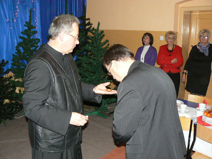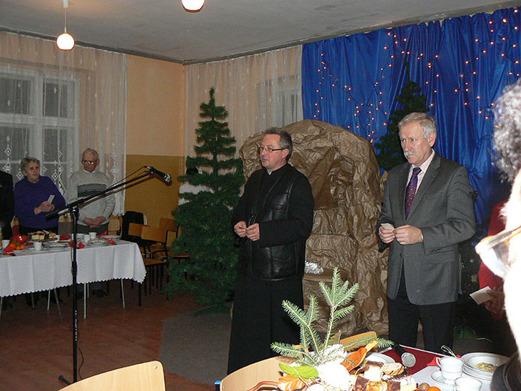 Po tym artystycznym akcencie ks. proboszcz Czesław Kocoń poprowadził nabożeństwo wieczoru wigilijnego, które zakończyło się życzeniami i łamaniem opłatkiem. Życzenia złożyła także wszystkim pani Bogumiła Pawlak i wiceburmistrz Gminy. Wszyscy zaproszeni goście życzyli seniorom zdrowych, radosnych, spokojnych świąt oraz szczęśliwego Nowego Roku. Po tych życzeniach nastąpiła wieczerza wigilijna z tradycyjnymi potrawami. We wspólnej wieczerzy wzięło udział około czterdzieści osób.