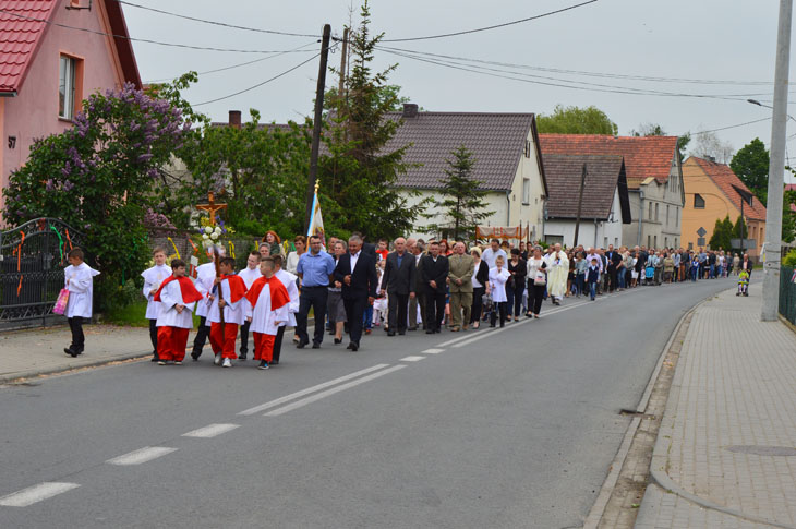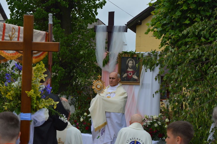 Po mszy św. wyszliśmy na ulice naszej wioski i udaliśmy się do 4 ołtarzy, aby w ten sposób dać świadectwo o obecności Jezusa Zmartwychwstałego w Eucharystii. I ołtarz był przy murze kościelnym. Został przygotowany przez rodziców dzieci I komunijnych. II przy sali Spółdzielni Produkcji Rolnej – ołtarz wykonały Róże Różańcowe. III ołtarz u Państwa Marszałków. Tutaj pomagali im sąsiedzi. Ostatni był przy Ośrodku zdrowia, który był wykonany przez mieszkańców bloku spółdzielczego. Procesja zakończyła się ok. godz. 12.30 odśpiewaniem Te Deum laudamus. Po błogosławieństwie odmówiliśmy modlitwę egzorcyzm św. Michała proszą przez jego wstawiennictwa Boga o deszcz.