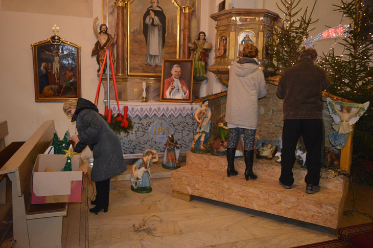 Najpierw postawiono konstrukcję szopy, którą odpowiednio udekorowano i umieszczono w niej figurki - postaci Bożego Narodzenia. Tadeusz Walczak i Adam Czeredrecki zajęli się także dekoracją choinek.