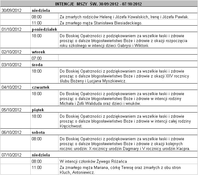 Intencje mszalne Wierzbnik - październik 2012